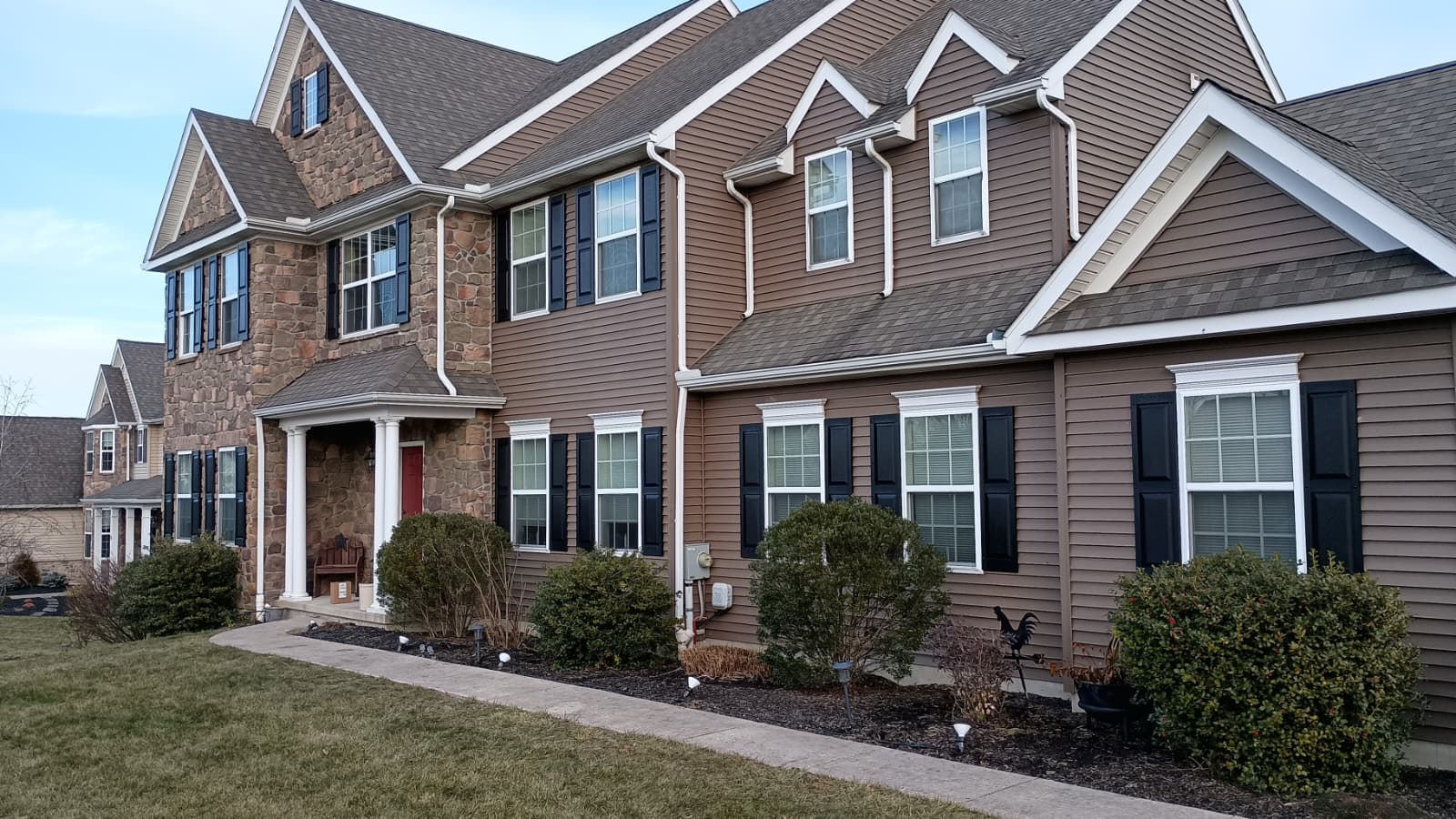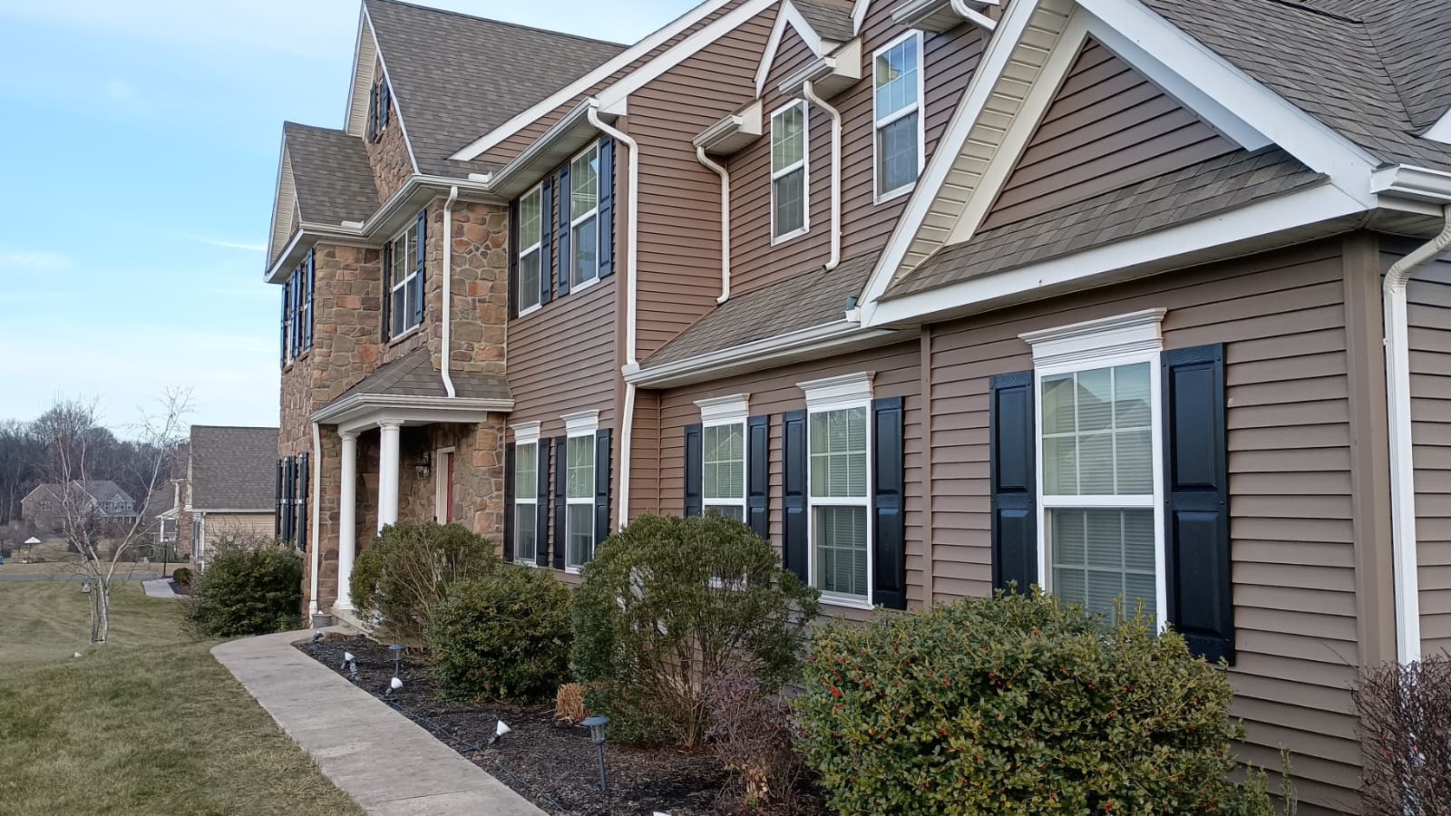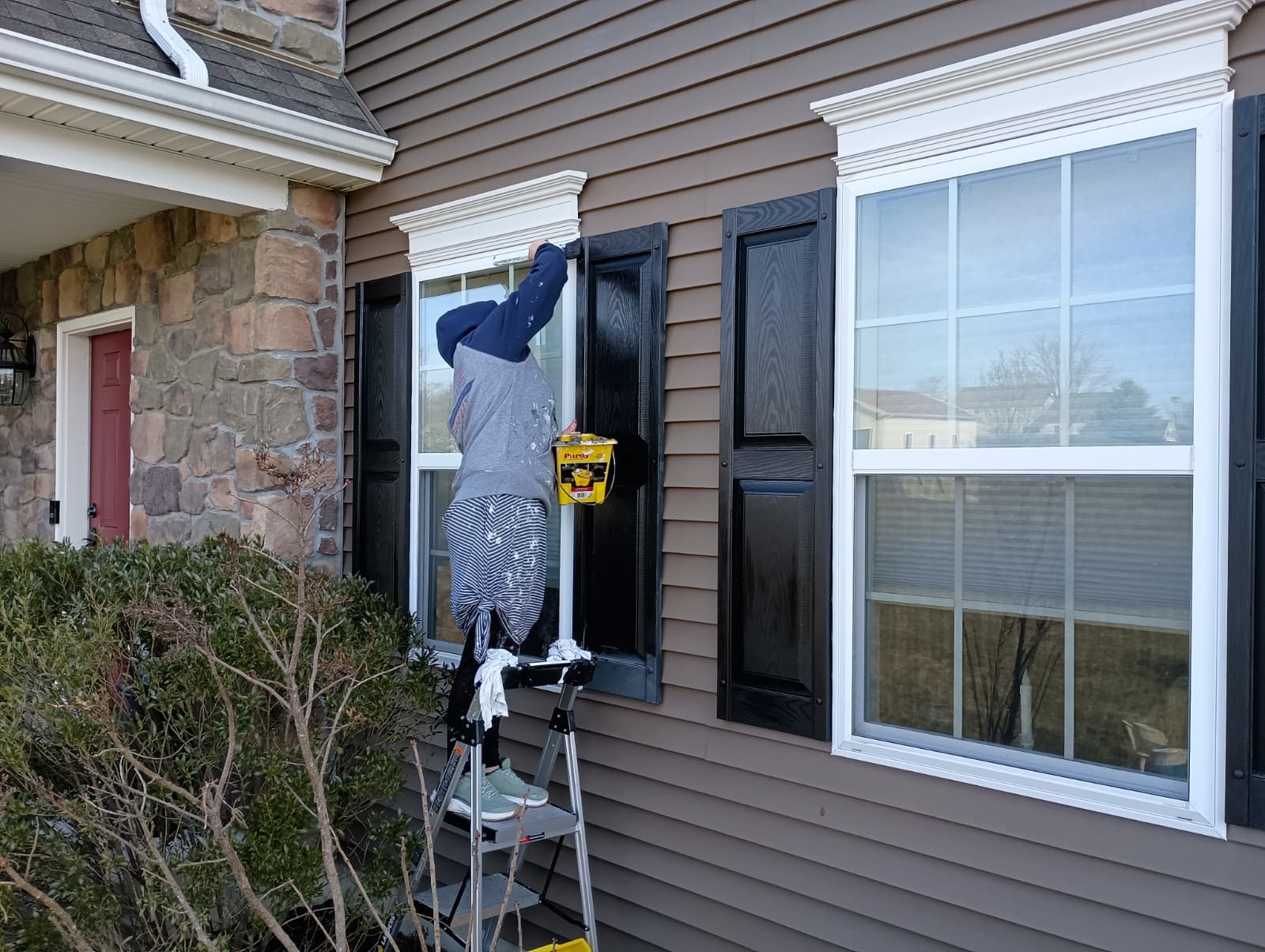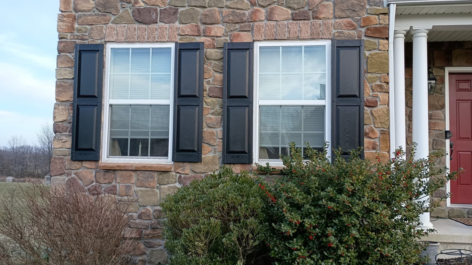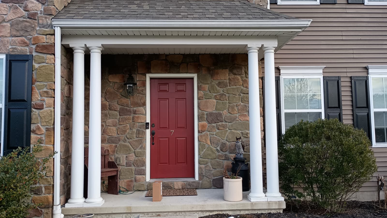 This house is simply magnificent. And we were thrilled to paint all of the shutters a rich black, empowering them to pop against the siding and stone walls of this home. Finally, we painted the front door a vibrant red, which makes it stand out as both a welcoming and bold entrance for all who enter this home.