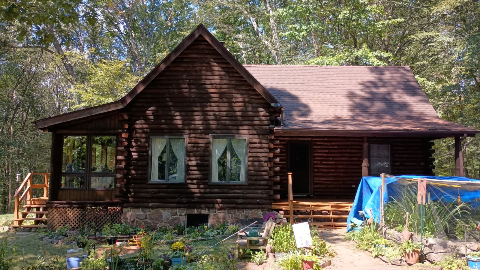 Staining your cabin isn’t just about protection; it also adds a pop of class. And this log cabin staining project in Dover, PA, is no different! Our team stained the cabin walls with a rich, moody shade. We contrasted the decks with a lighter stain, creating a vibrant finish on each aspect of this beautiful cabin. What color of stain would you choose for your log cabin?